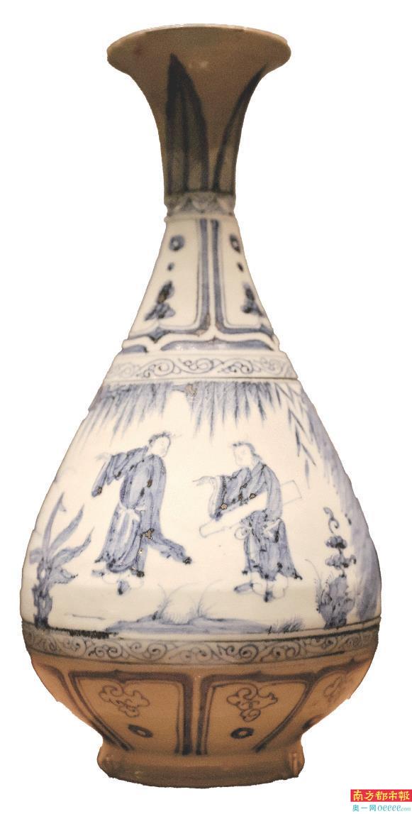 元青花人物图玉壶春瓶。