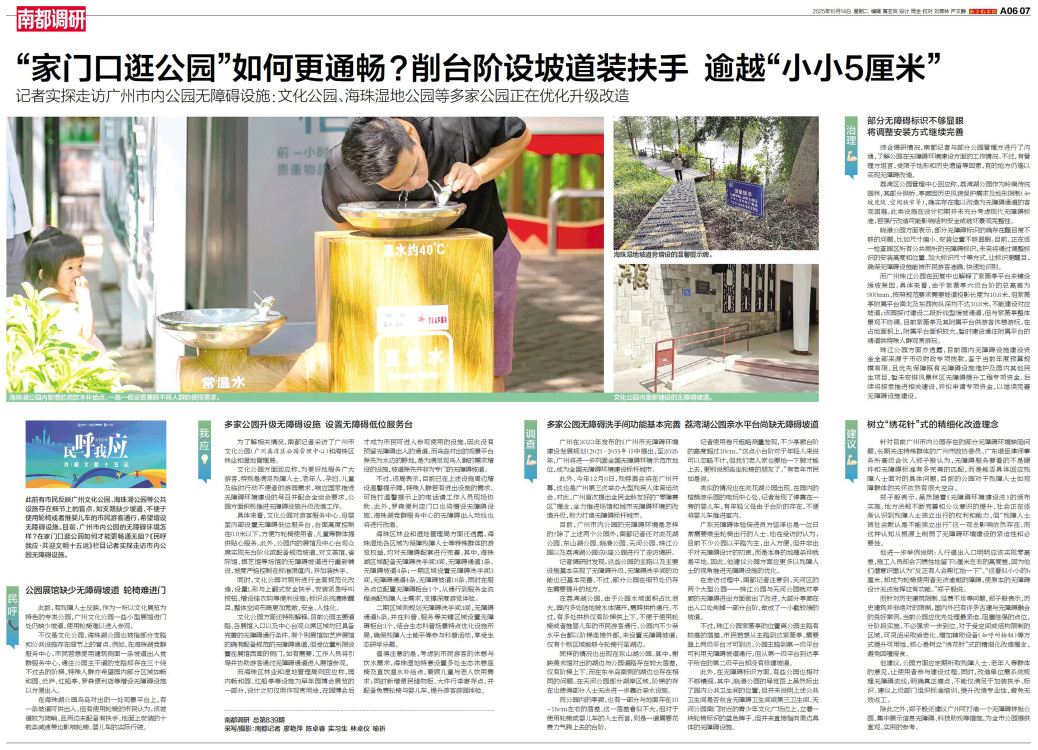 此前有市民反映广州文化公园、海珠湖公园等公共设施存在细节上的盲点,如支路缺少坡道,不便于使用轮椅或者推婴儿车的市民游客通行,希望增设无障碍设施。