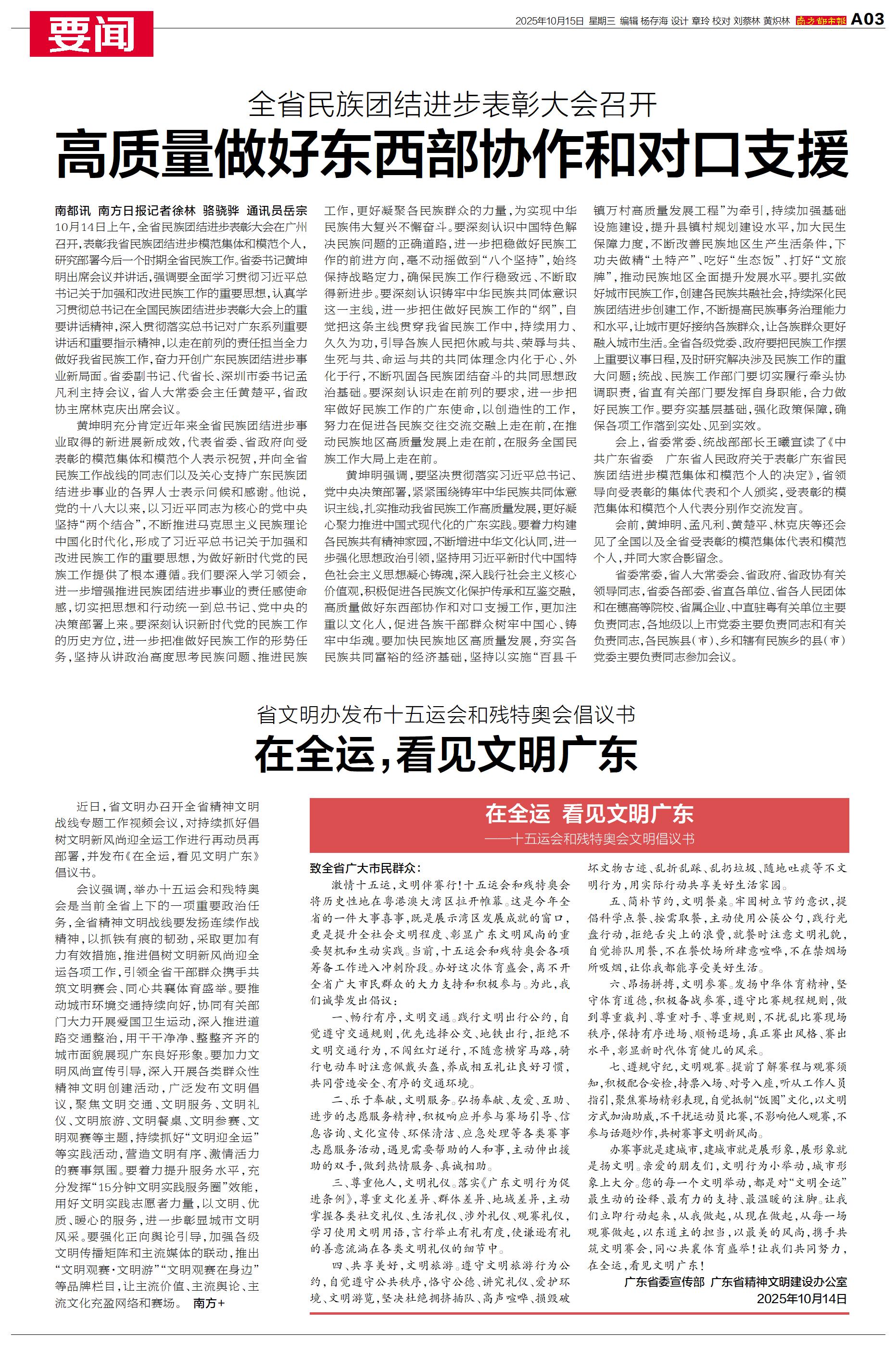 近日,省文明办召开全省精神文明战线专题工作视频会议,对持续抓好倡树文明新风尚迎全运工作进行再动员再部署,并发布《在全运,看见文明广东》倡议书。