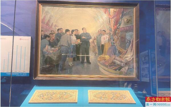上面展现的是广东画家李金明创作的油画《周总理与广交会》;下面展现的是早年广交会热销产品种类:潮州抽纱。