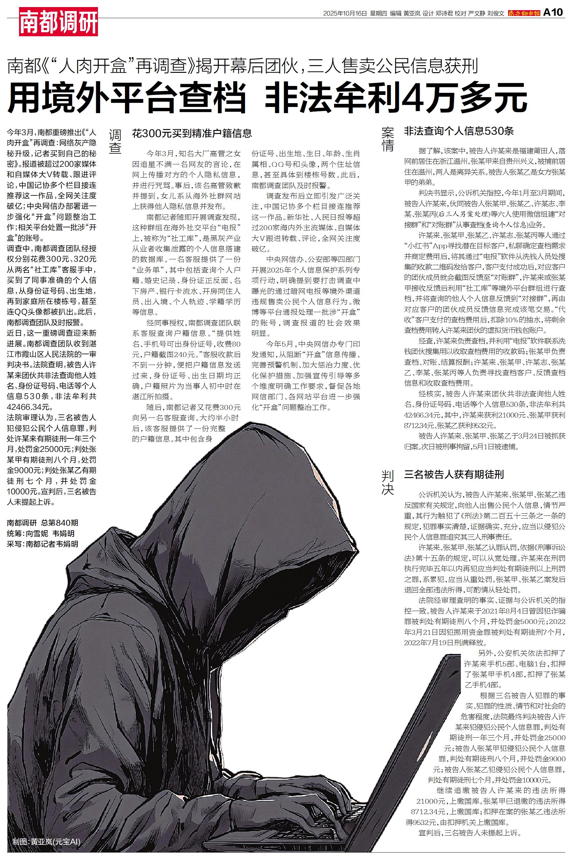 今年3月,南都重磅推出《“人肉开盒”再调查:网络灰产隐秘升级,记者买到自己的秘密》。