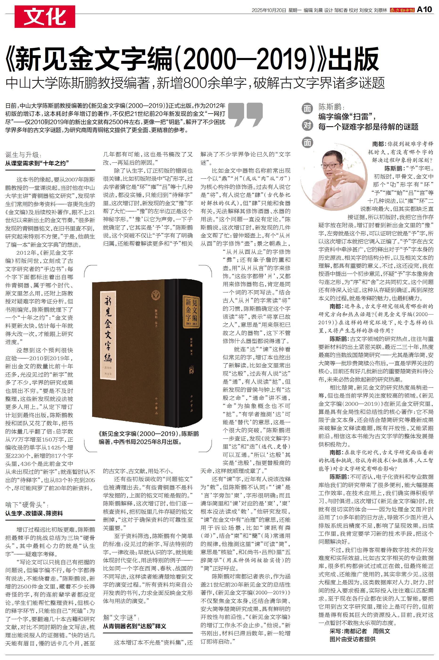 日前,中山大学陈斯鹏教授编著的《新见金文字编(2000—2019)》正式出版。