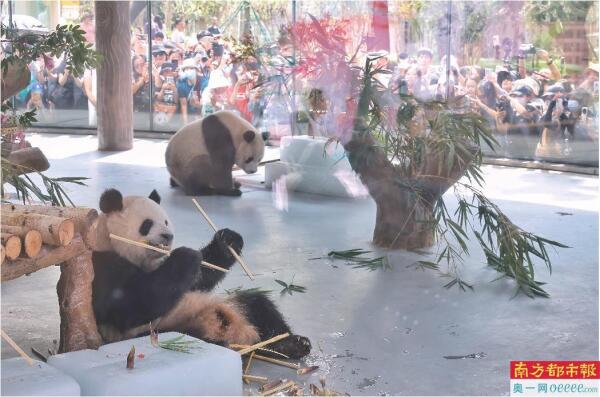 当天早上,记者走进新大熊猫馆内看到,双胞胎兄弟“久久”“友友”正聚在一起,津津有味地品尝着竹子竹笋,大快朵颐之后便开始嬉戏打闹。