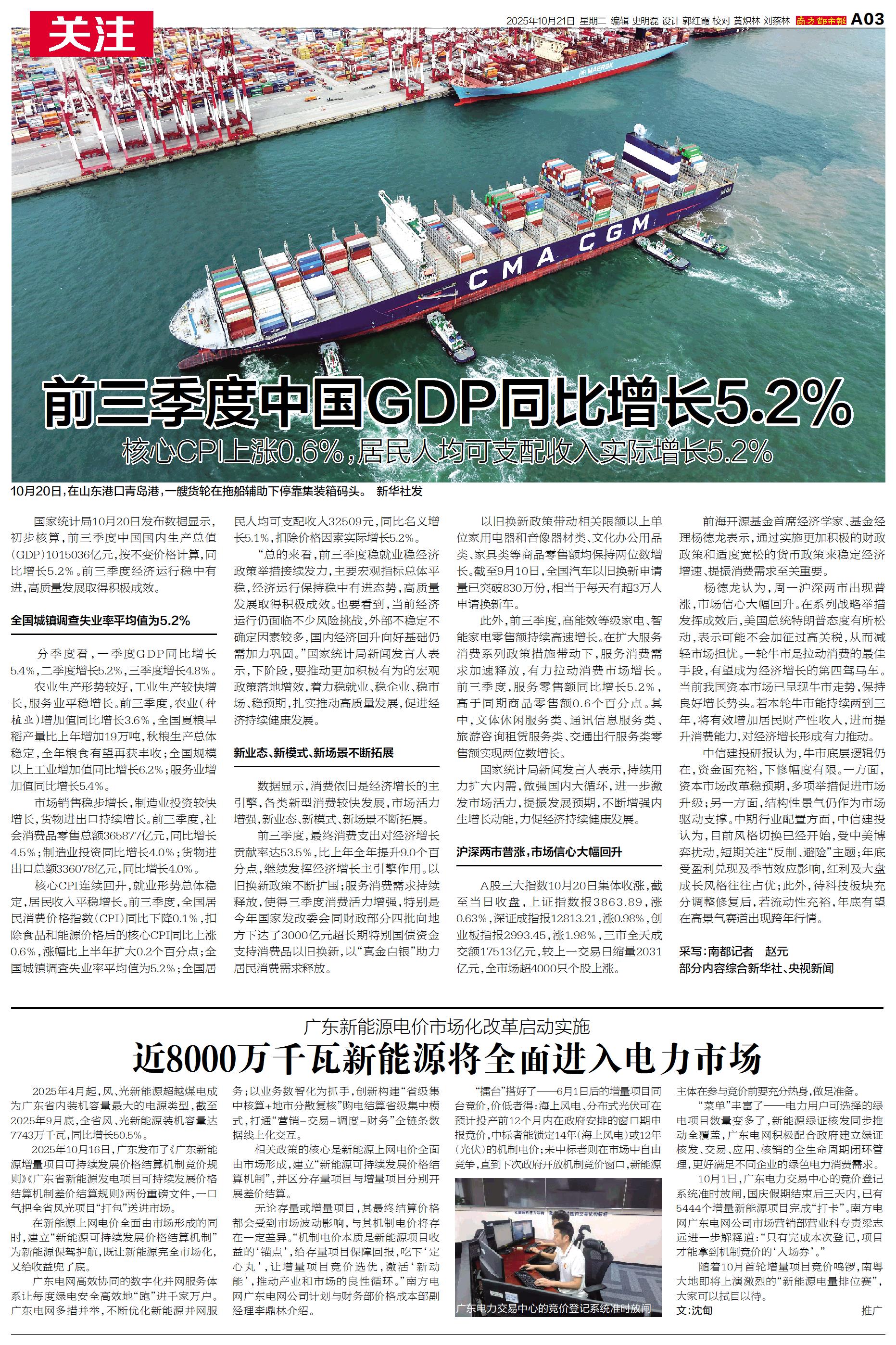 前三季度中国GDP同比增长5.2%