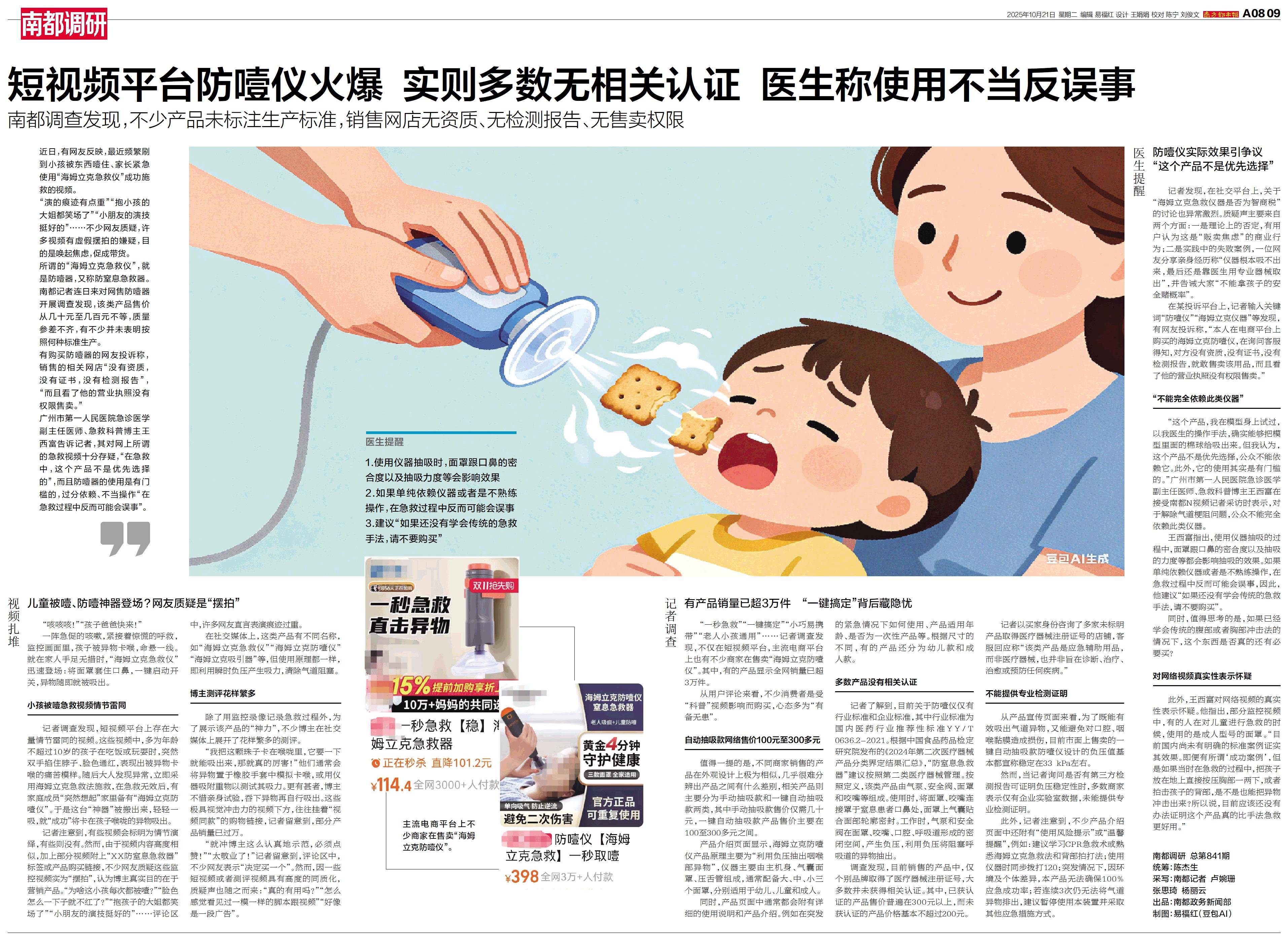 短视频平台防噎仪火爆 实则多数无相关认证 医生称使用不当反误事