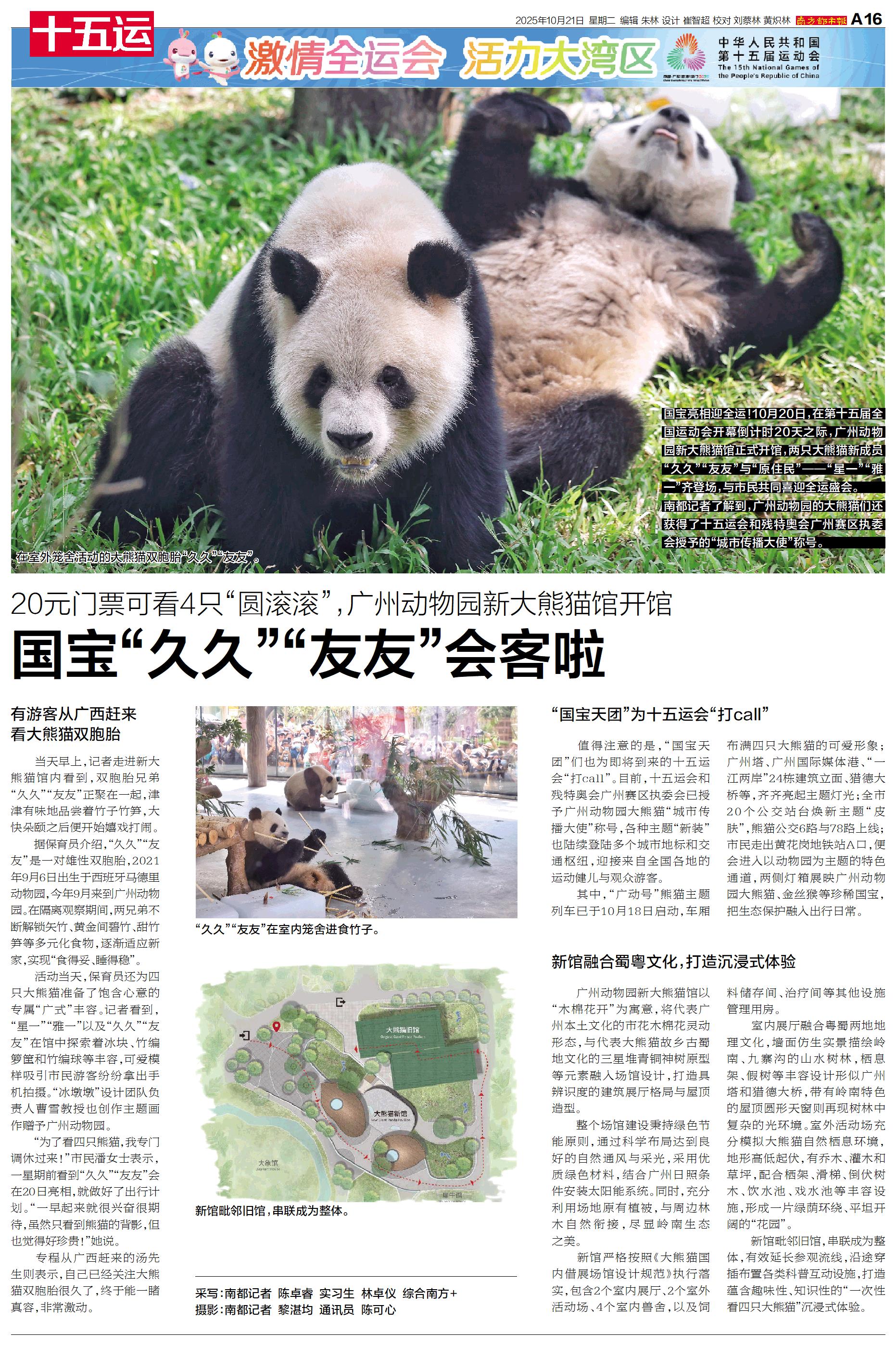 国宝亮相迎全运!10月20日,在第十五届全国运动会开幕倒计时20天之际,广州动物园新大熊猫馆正式开馆,两只大熊猫新成员“久久”“友友”与“原住民”——“星一”“雅一”齐登场,与市民共同喜迎全运盛会。