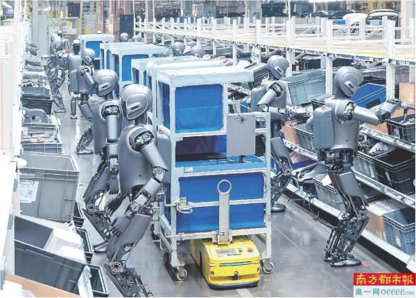 优必选工业人形机器人“群体智能”在极氪5G智慧工厂开展协同实训。 南方日报记者 朱洪波 通讯员 罗艳 摄