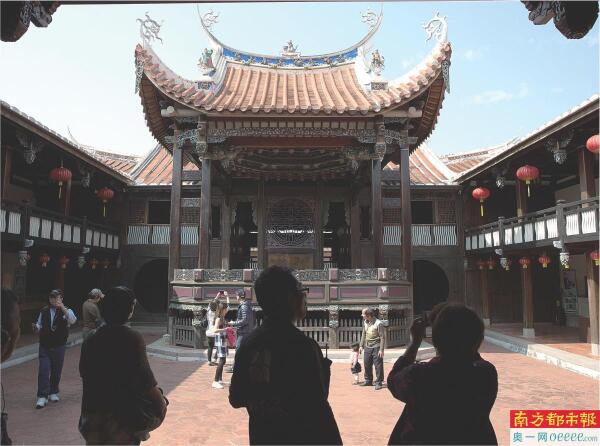 据了解,雾峰林家保存着全台最庞大、最精致的古建筑群,从南到北宽300米,总面积达1.1万多平方米。林义旻向南都记者介绍,“根据祖训,雾峰林家所有建筑正房一律坐东朝西,朝向大陆,以此告诫后人:不要忘记祖宗和故乡。”