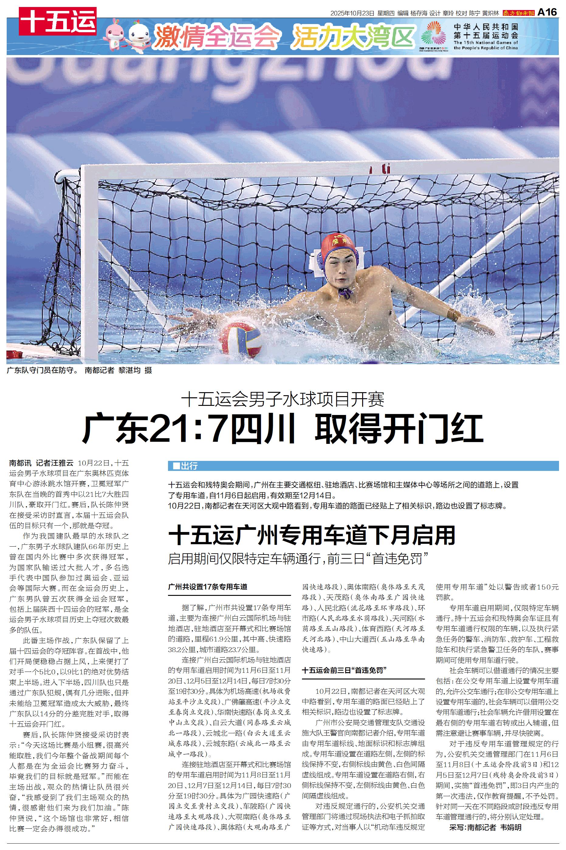 10月22日,十五运会男子水球项目在广东奥林匹克体育中心游泳跳水馆开赛,卫冕冠军广东队在当晚的首秀中以21比7大胜四川队,豪取开门红。