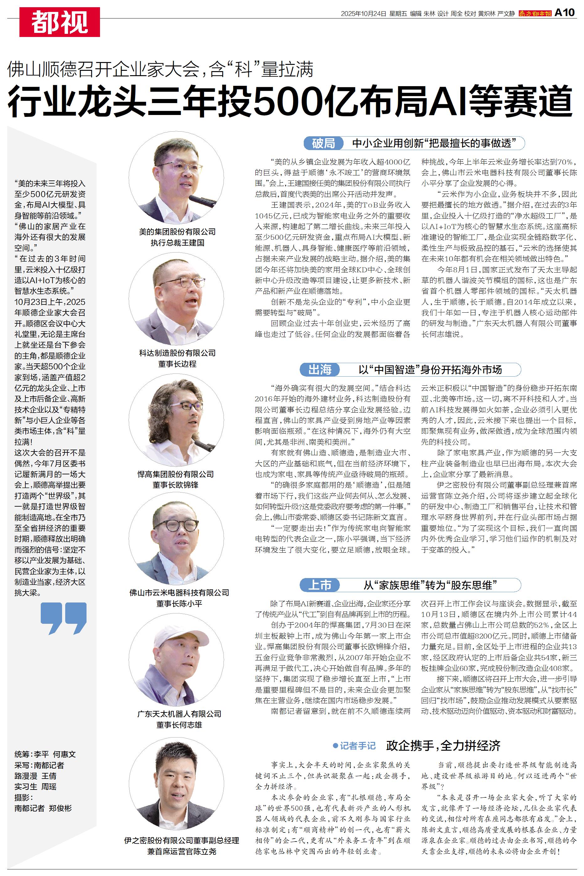10月23日上午,2025年顺德企业家大会召开。顺德区会议中心大礼堂里,无论是主席台上就坐还是台下参会的主角,都是顺德企业家。