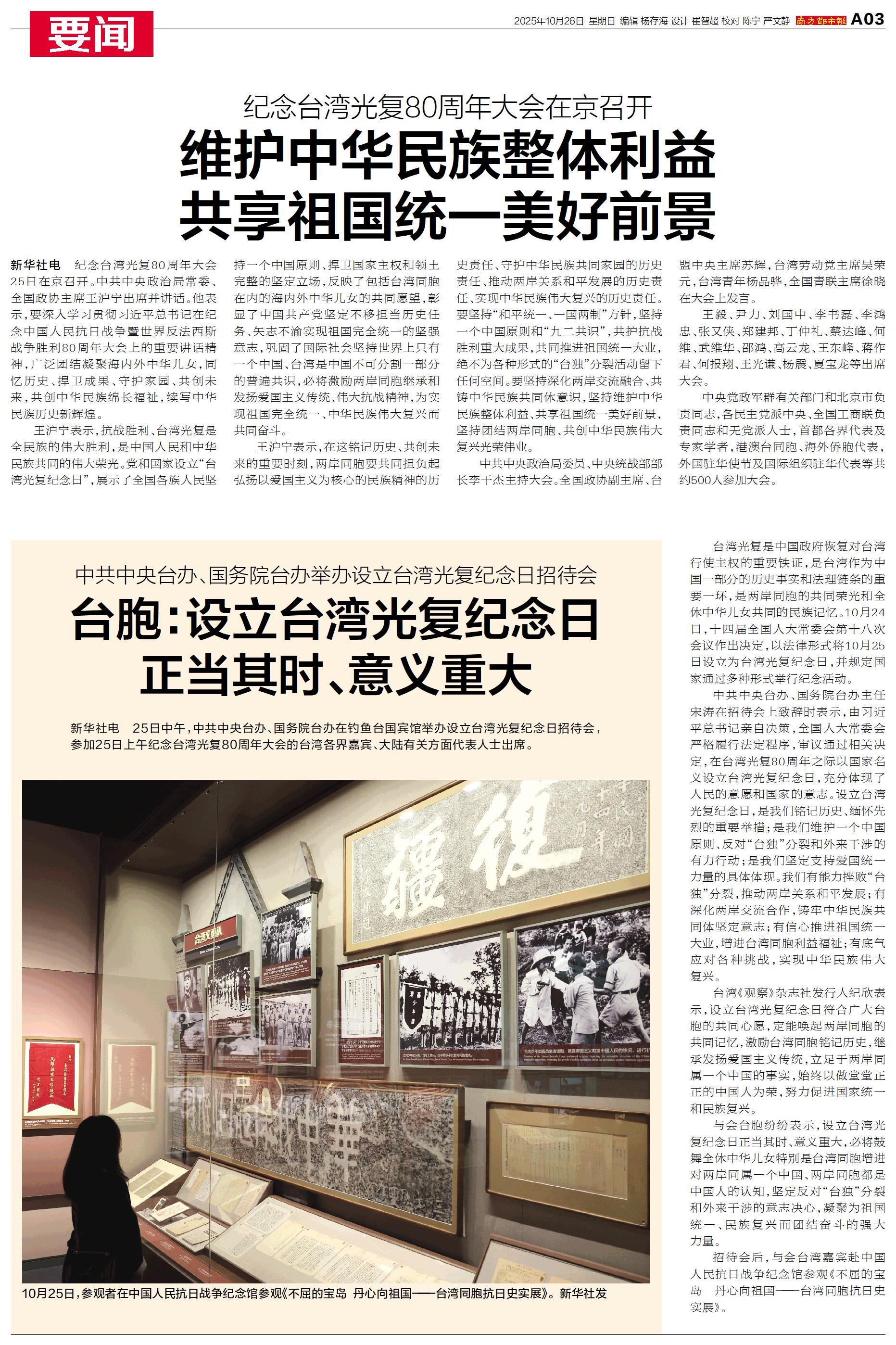 25日中午,中共中央台办、国务院台办在钓鱼台国宾馆举办设立台湾光复纪念日招待会,参加25日上午纪念台湾光复80周年大会的台湾各界嘉宾、大陆有关方面代表人士出席。