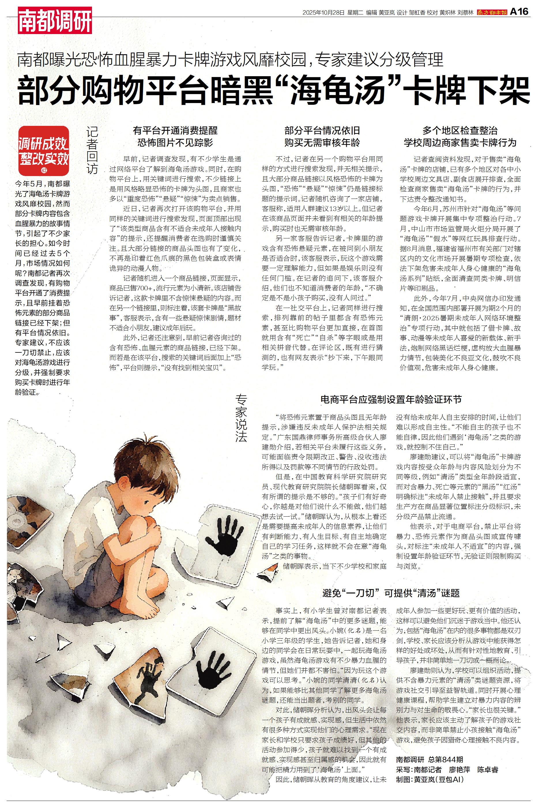 今年5月,南都曝光了海龟汤卡牌游戏风靡校园,然而部分卡牌内容包含血腥暴力的故事情节,引起了不少家长的担心。