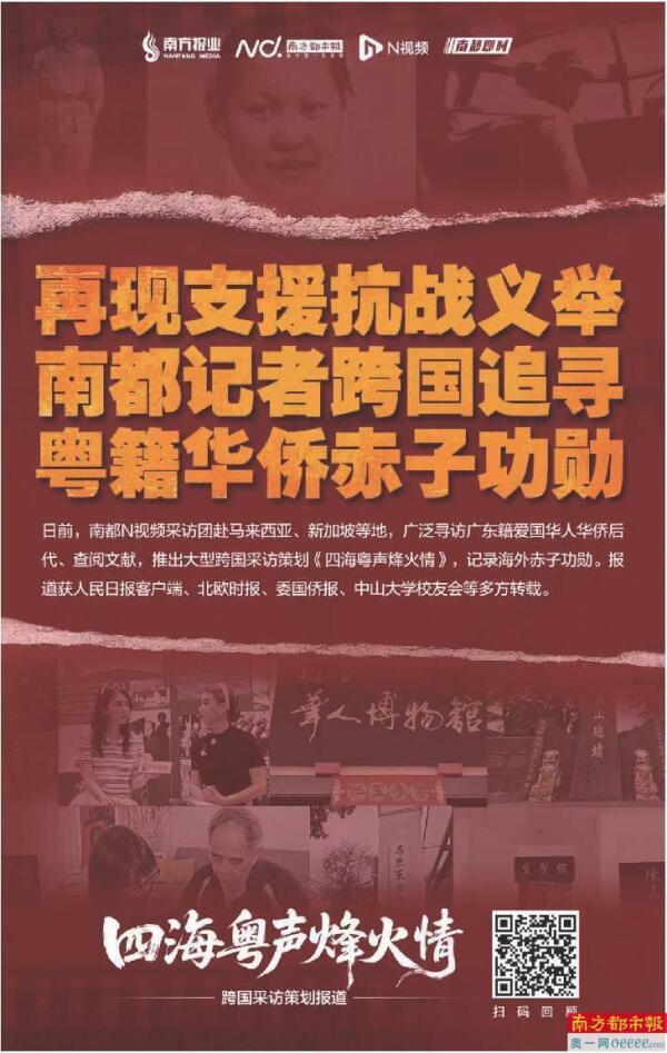 为更好地挖掘、记录广东籍华人华侨为支援祖国抗战做出的牺牲,进一步传承和弘扬伟大抗战精神,今年8月,南都N视频采访团王佳、向雪妮、肖玥、张倩寒、马辉,奔赴马来西亚、新加坡等地,广泛寻访华人华侨后代、查阅相关文献,推出大型跨国采访策划《四海粤声烽火情》。采访团走访吉隆坡广东义山、马来西亚华人博物馆、新加坡旧福特车厂二战历史博物馆等地,多方采访,从筹赈救国、南侨机工、战场抗敌等方面突出广东籍华侨的抗战事迹。