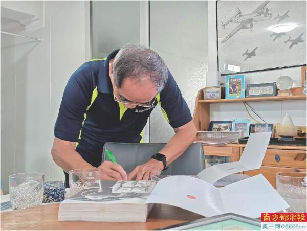 飞虎队老兵何永道之子何建宇向南都N视频记者签字赠书。