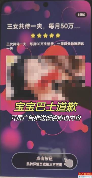 “宝宝巴士APP推送低俗色情广告终于被大家看到了!”看到新闻后,杜女士松了口气。她告诉南都记者,早在去年9月,自己的会员刚过期后没几天,就看到宝宝巴士儿歌APP弹窗推送有露骨情节的情色视频广告,“气死了,我直接卸载,别想赚我一分钱”。时隔一年,又有家长在社交媒体发文,宝宝巴士儿歌APP打开时,开屏跳转低俗擦边直播等第三方广告。网友截图显示,有广告页面直接打出“三女共侍一夫,每月50万生活费”的标题,并可看到着装暴露的女士。