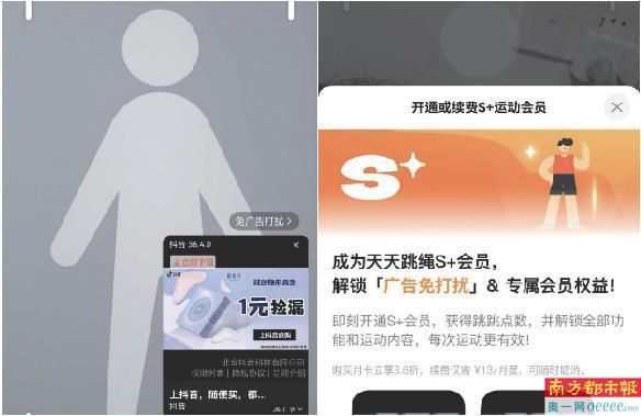 南都记者测评后发现,曾在小学生中风靡的天天跳绳,运动前要先看广告,点击跳绳后即出现短视频平台弹窗广告,如果想免打扰则需要开通会员。此外,家长们发现,该运动APP突然出现较多小游戏,令孩子沉迷。