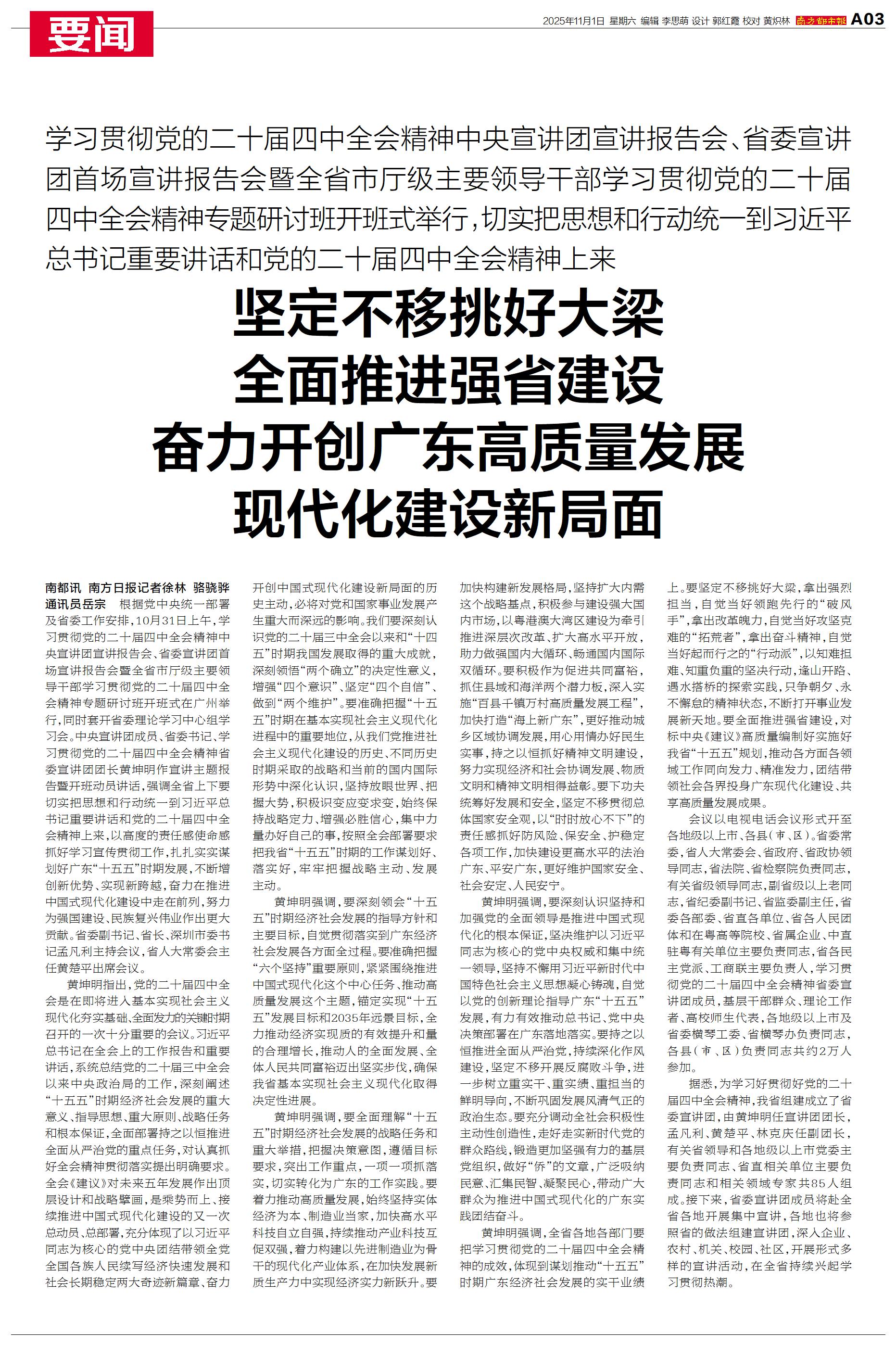 10月31日上午,学习贯彻党的二十届四中全会精神中央宣讲团宣讲报告会、省委宣讲团首场宣讲报告会暨全省市厅级主要领导干部学习贯彻党的二十届四中全会精神专题研讨班开班式在广州举行。