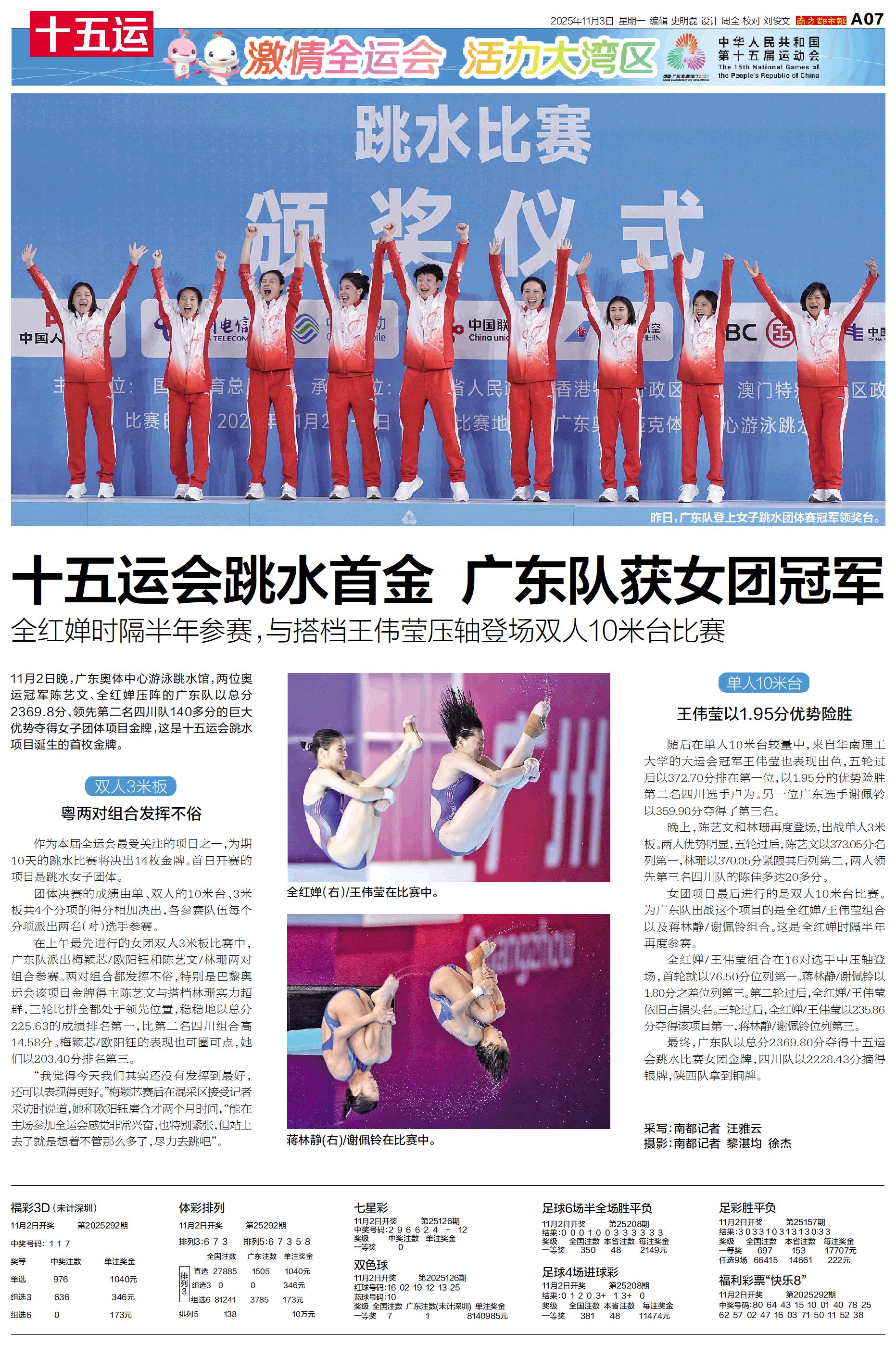 11月2日晚,广东奥体中心游泳跳水馆,两位奥运冠军陈艺文、全红婵压阵的广东队以总分2369.8分、领先第二名四川队140多分的巨大优势夺得女子团体项目金牌,这是十五运会跳水项目诞生的首枚金牌。