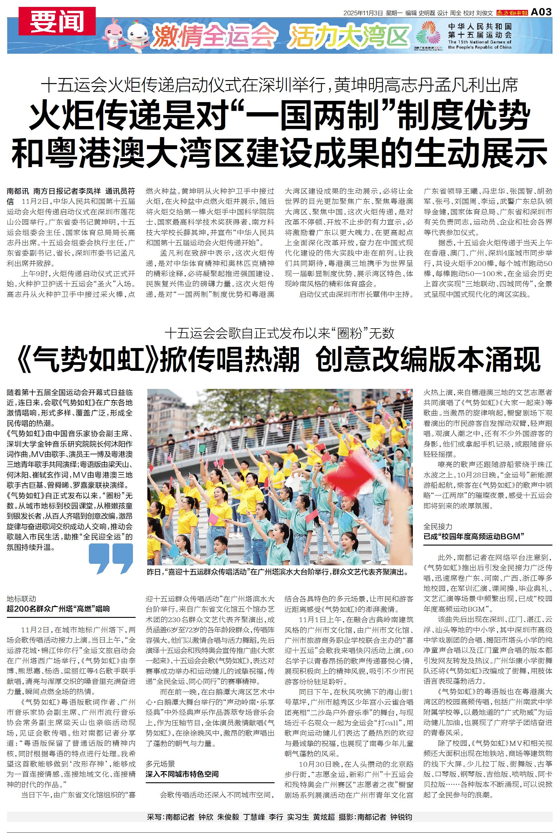 随着第十五届全国运动会开幕式日益临近,连日来,会歌《气势如虹》在广东各地激情唱响,形式多样、覆盖广泛,形成全民传唱的热潮。
