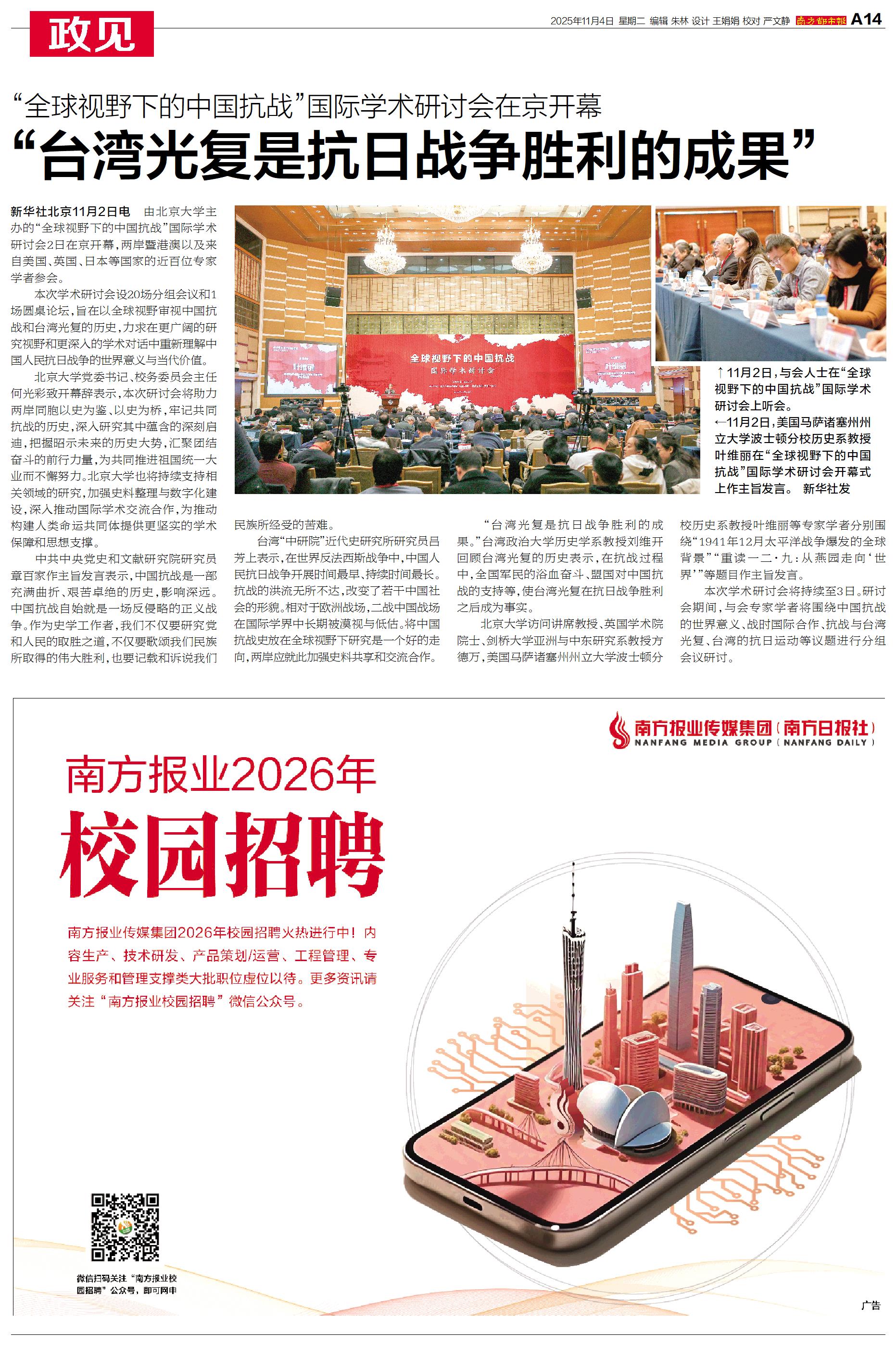 新华社北京11月2日电 由北京大学主办的“全球视野下的中国抗战”国际学术研讨会2日在京开幕,两岸暨港澳以及来自美国、英国、日本等国家的近百位专家学者参会。
