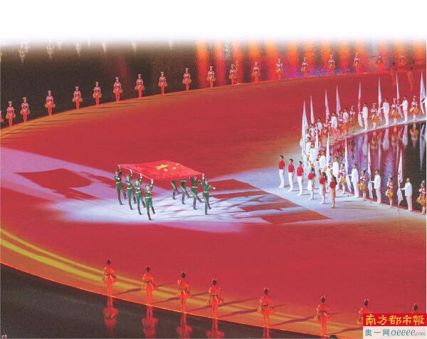 仪仗兵护卫着鲜艳的五星红旗健步走入体育场。