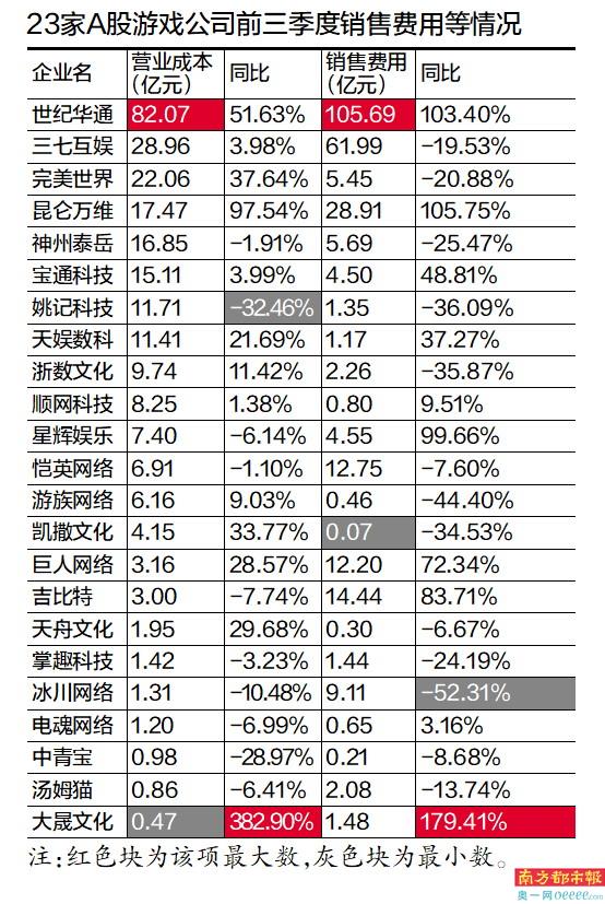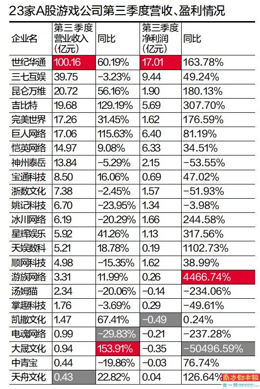 根据南都记者初步统计,截至今年9月,共有8家公司营业收入超过30亿元,按照金额大小依次是世纪华通、三七互娱、昆仑万维、完美世界、吉比特、恺英网络、神州泰岳和巨人网络。