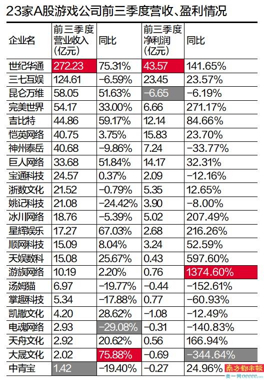南都记者对A股游戏公司中的23家进行初步统计后发现,今年第三季度,有13家营业收入实现同比正增长,18家实现盈利(归母净利润),而去年同期,实现营收同比正增长的公司仅8家,实现盈利的公司有17家。同时,今年23家公司营业收入总计299.99亿元,比去年同期的232.03亿元增长了29.29%;净利润合计58.15亿元,相较去年同期的29.05亿元而言,直接翻番。