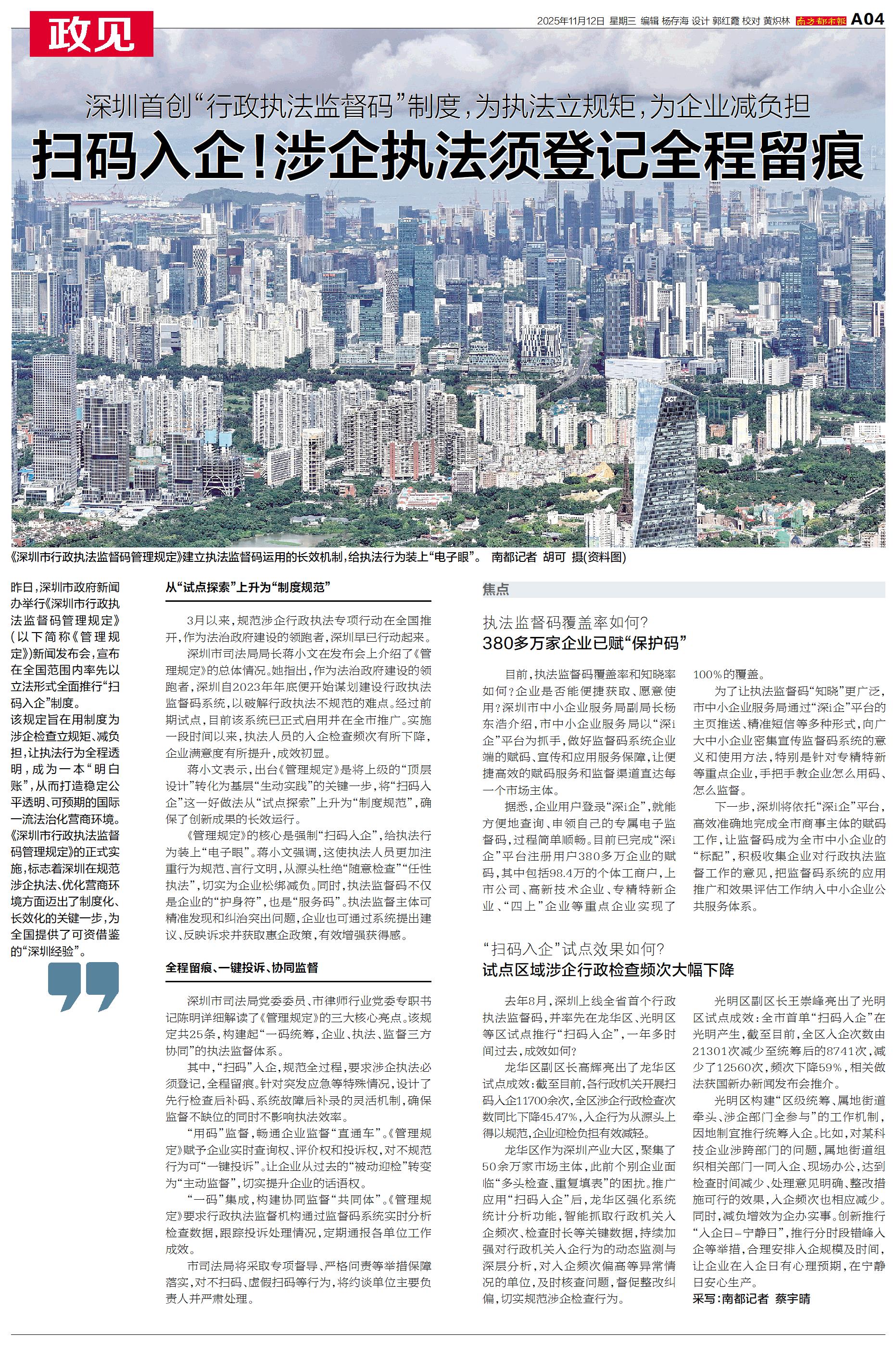 昨日,深圳市政府新闻办举行《深圳市行政执法监督码管理规定》新闻发布会,宣布在全国范围内率先以立法形式全面推行“扫码入企”制度。