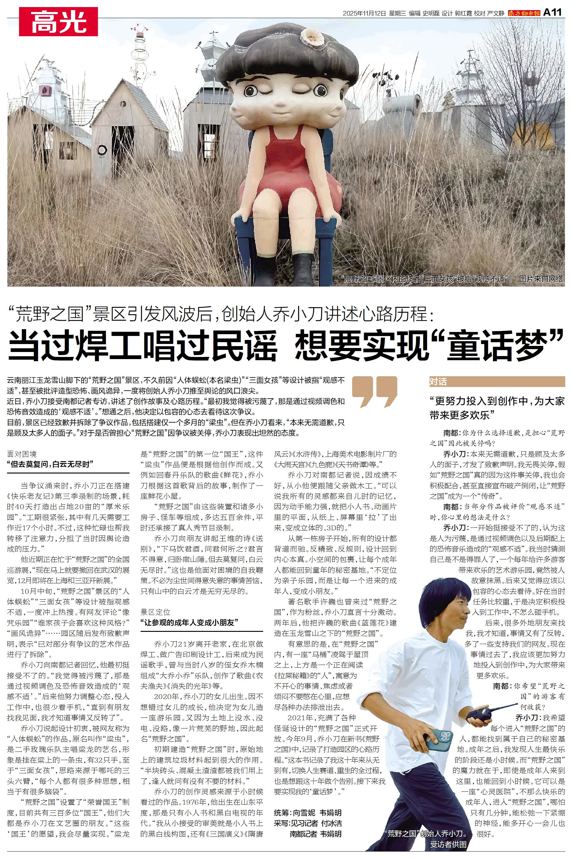云南丽江玉龙雪山脚下的“荒野之国”景区,不久前因“人体蜈蚣(本名梁虫)”“三面女孩”等设计被指“观感不适”,甚至被批评造型恐怖、画风诡异,一度将创始人乔小刀推至舆论的风口浪尖。