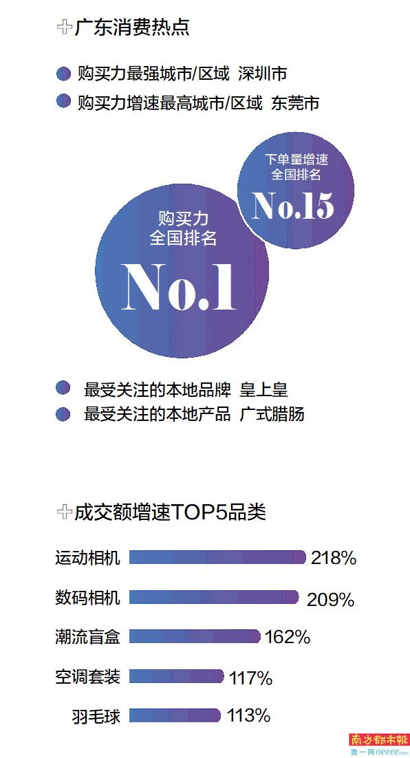 按区域来看,京东11.11消费情况显示,广东省在此次大促期间购买力排名第一,稳坐全国消费C位。在广东省内,深圳市是购买力最强的城市,东莞市的购买力增速最高。知名的“广字头”品牌众多,“皇上皇”是最受关注的本地品牌,“广式腊肠”是最受关注的本地产品。