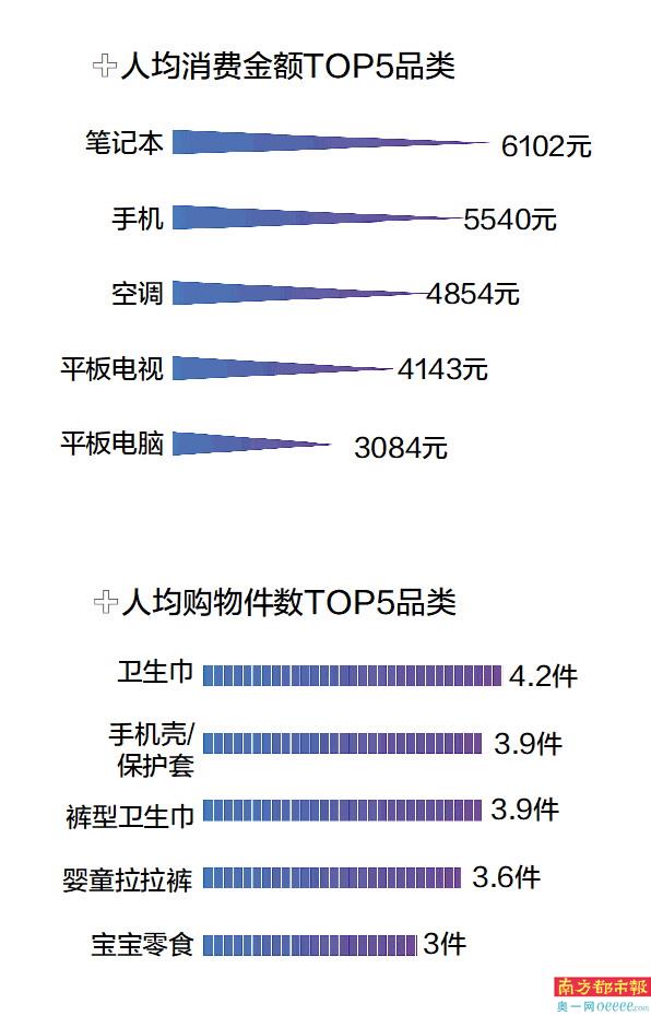 从人均消费金额来看,笔记本、手机、空调、平板电视、平板电脑是人均消费金额前五名的品类,分别高达6102元、5540元、4854元、4143元、3084元。个人护理用品与婴童用品是人均购物件数较多的品类,卫生巾、手机壳/保护套、裤型卫生巾、婴童拉拉裤、宝宝零食是人均购物件数TOP5品类,人均购物件数分别为4.2件、3.9件、3.9件、3.6件、3件。