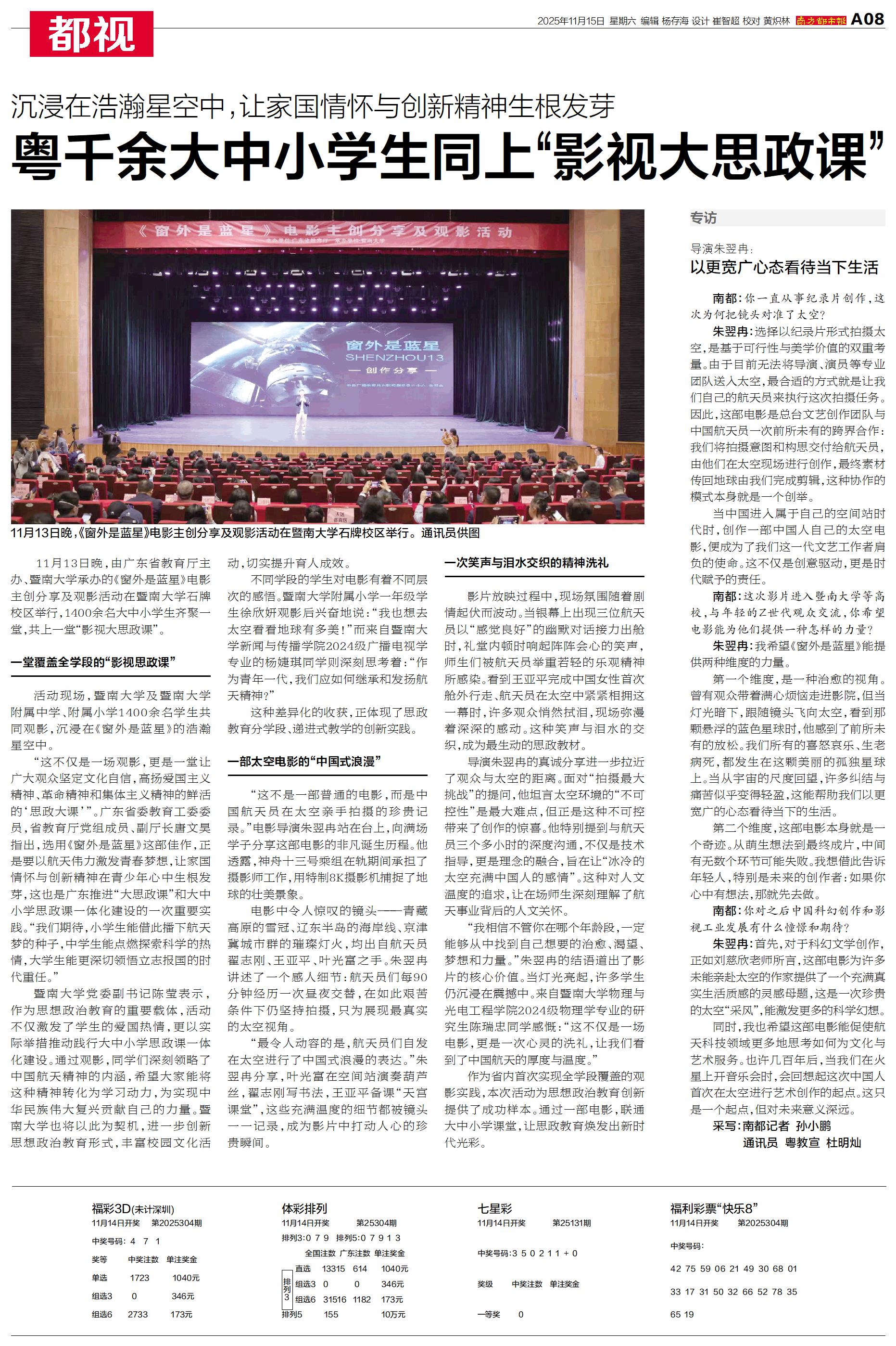 11月13日晚,由广东省教育厅主办、暨南大学承办的《窗外是蓝星》电影主创分享及观影活动在暨南大学石牌校区举行,1400余名大中小学生齐聚一堂,共上一堂“影视大思政课”。