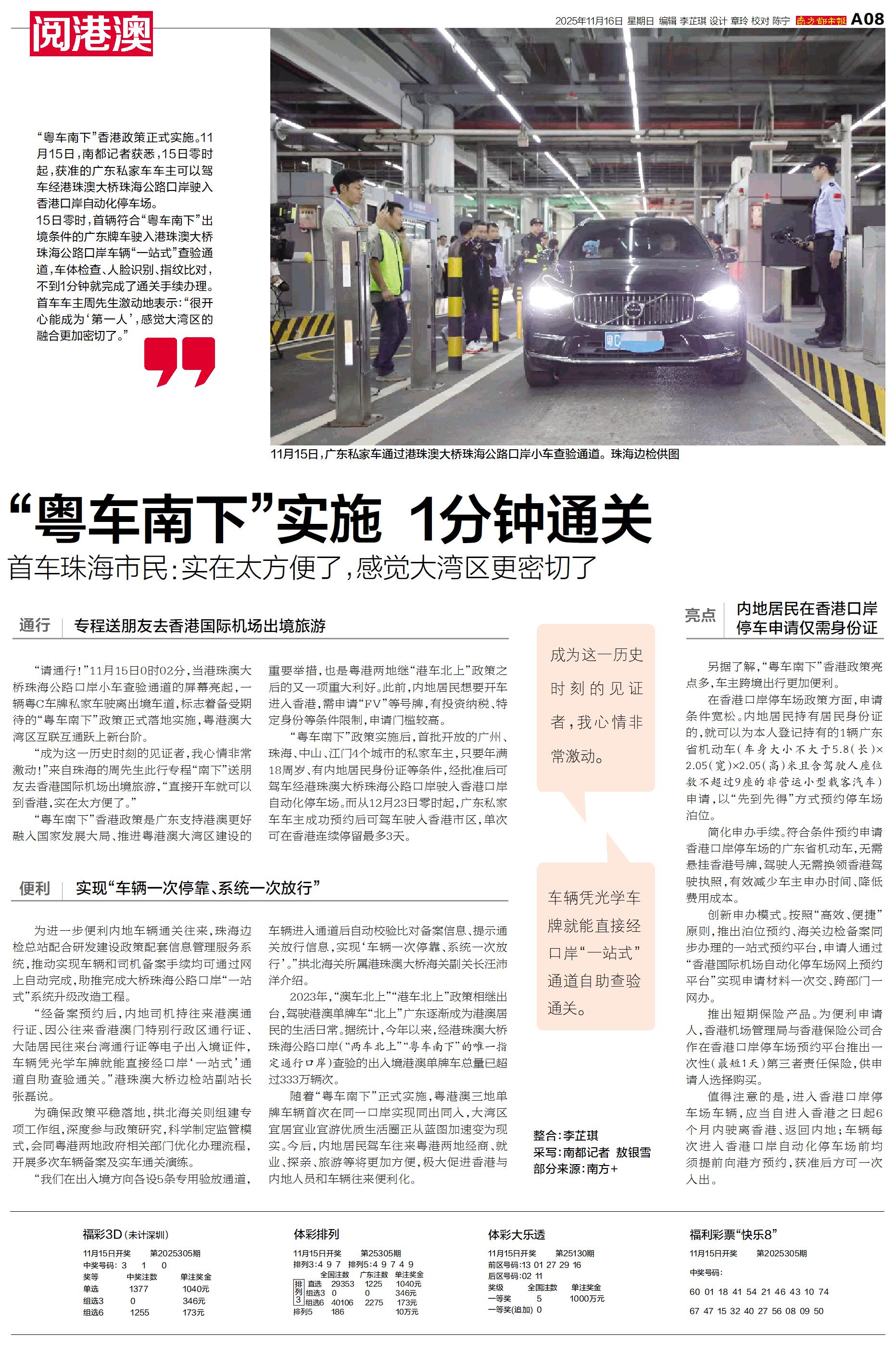 11月15日,南都记者获悉,15日零时起,获准的广东私家车车主可以驾车经港珠澳大桥珠海公路口岸驶入香港口岸自动化停车场。