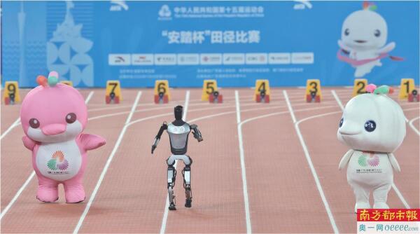 吉祥物和机器人在百米赛道上PK,为比赛暖场。 南都记者 黎湛均 摄