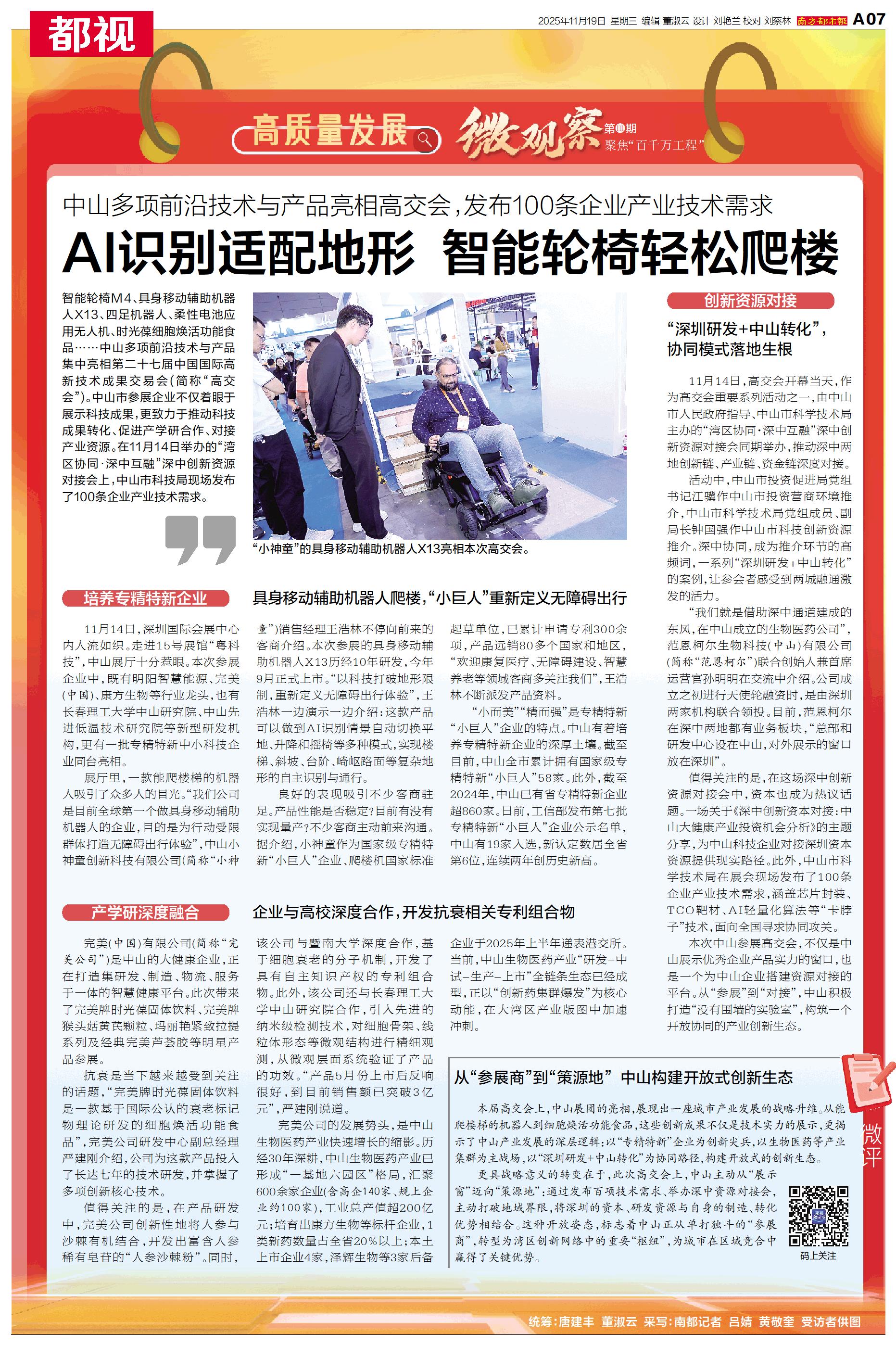 智能轮椅M4、具身移动辅助机器人X13、四足机器人、柔性电池应用无人机、时光葆细胞焕活功能食品……中山多项前沿技术与产品集中亮相第二十七届中国国际高新技术成果交易会(简称“高交会”)。