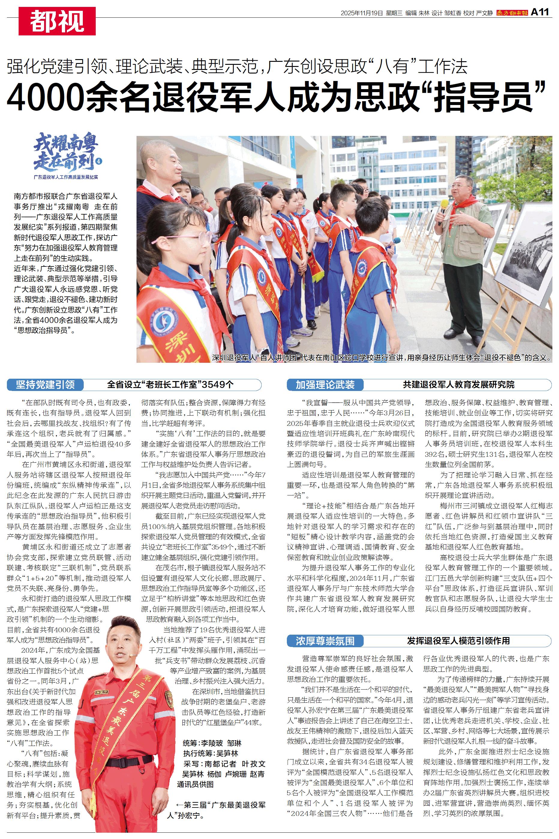 近年来,广东通过强化党建引领、理论武装、典型示范等举措,引导广大退役军人永远感党恩、听党话、跟党走,退役不褪色、建功新时代。