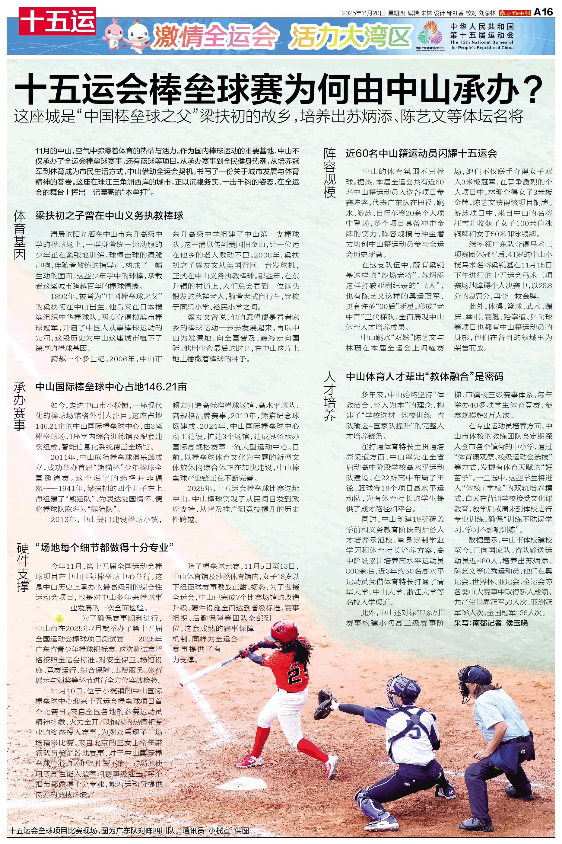 11月的中山,空气中弥漫着体育的热情与活力。作为国内棒球运动的重要基地,中山不仅承办了全运会棒垒球赛事,还有篮球等项目。从承办赛事到全民健身热潮,从培养冠军到体育成为市民生活方式,中山借助全运会契机,书写了一份关于城市发展与体育精神的答卷。这座在珠江三角洲西岸的城市,正以沉稳务实、一击千钧的姿态,在全运会的舞台上挥出一记漂亮的“本垒打”。