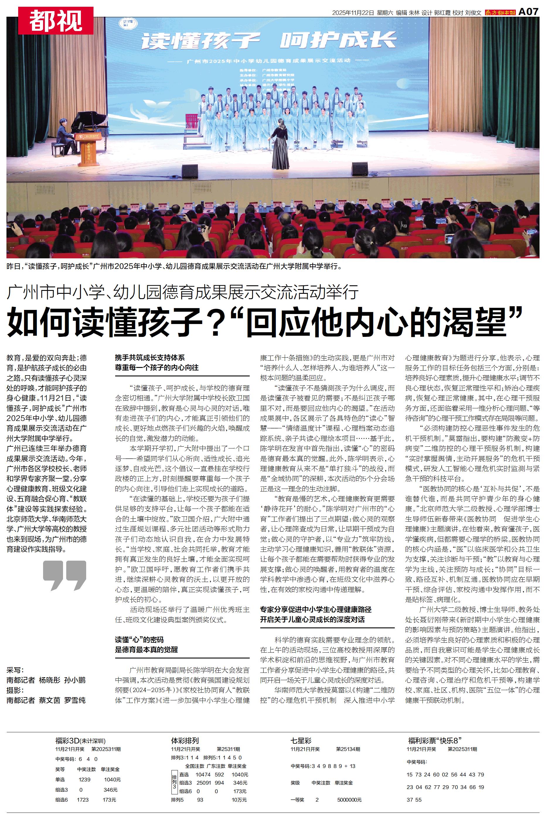 教育,是爱的双向奔赴;德育,是护航孩子成长的必由之路。只有读懂孩子心灵深处的呼唤,才能呵护孩子的身心健康。11月21日,“读懂孩子,呵护成长”广州市2025年中小学、幼儿园德育成果展示交流活动在广州大学附属中学举行。