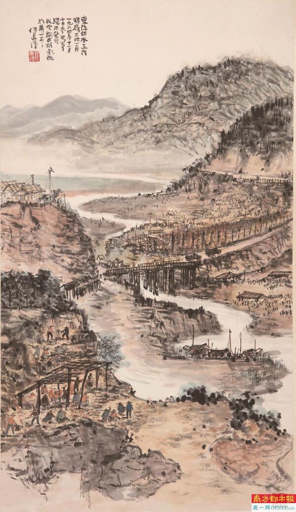 展览中,可以看到1964年香港画家任真汉绘《东深供水工程图》,这是香港画家任真汉1964年11月赴东江供水工程东莞旗岭、塘头厦施工现场参观后所绘。
