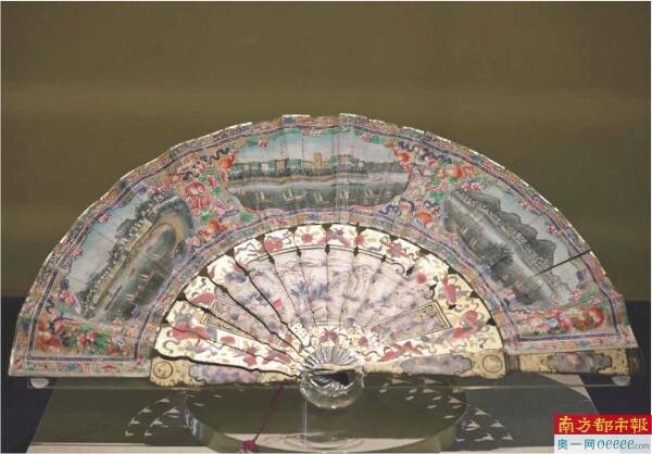 该扇扇骨采用了银镀金、烧蓝、染牙、玳瑁骨等多种材质及工艺,具有典型的广州外销工艺特色。扇面开光所绘清代省港澳三地风景,是19世纪广州外销工艺品的经典题材。此类外销扇深受海外人士欢迎,省港澳三地的港口风景,是19世纪外国人对中国广东的第一印象。