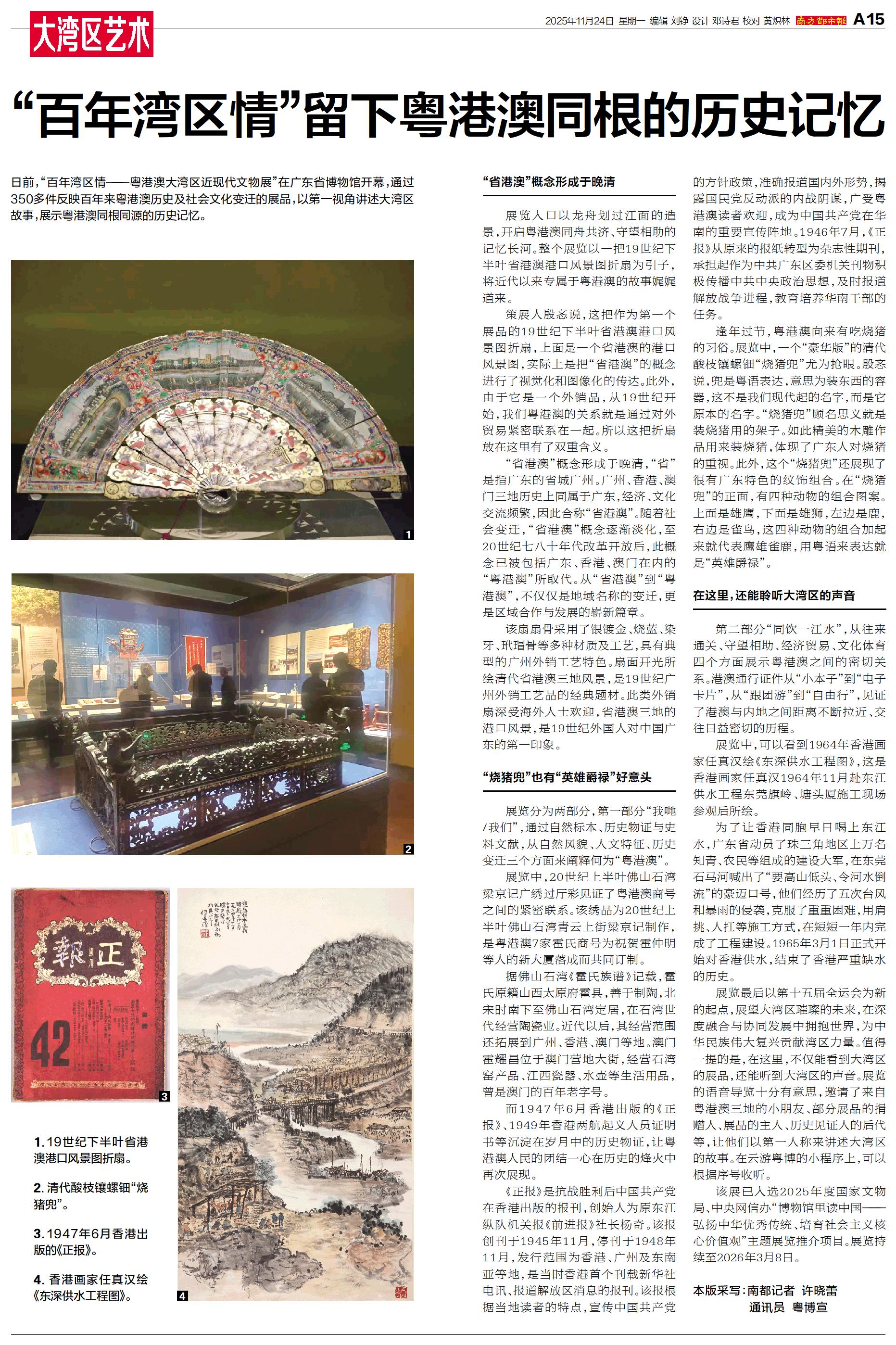 日前,“百年湾区情——粤港澳大湾区近现代文物展”在广东省博物馆开幕,通过350多件反映百年来粤港澳历史及社会文化变迁的展品,以第一视角讲述大湾区故事,展示粤港澳同根同源的历史记忆。