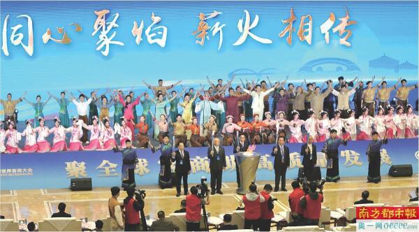 11月24日,第七届世界客商大会在梅州市世界客商中心开幕。5位海内外客商代表、客籍侨领及青年代表共同点燃“同心聚焰·薪火相传”主火炬。 梅州日报供图