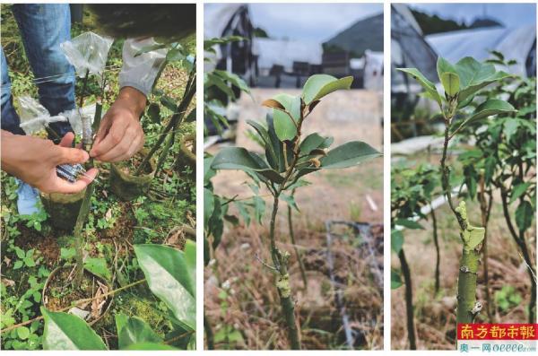 研究团队在象头山苗圃开展博罗红豆嫁接实验及少数嫁接存活的个体。
