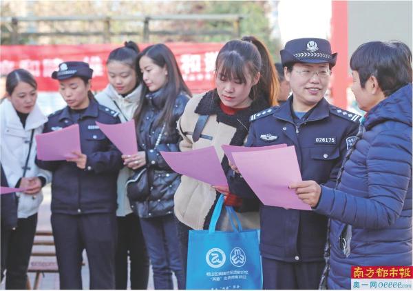 2021年11月23日,安徽省淮北市公安局相山公安分局妇联的女民警向社区居民宣传反家暴知识。 IC供图