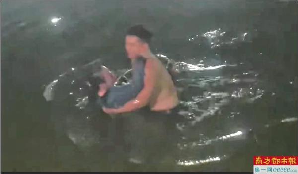 深夜,阳江市阳西县东湖森林公园突然传来呼救声,一名女子落水后拼命挣扎。这时,一名男子迅速脱掉衣物,跃入冰冷的湖水中。左手划水,右手揽着女子,奋力向岸边游去,成功完成救援。