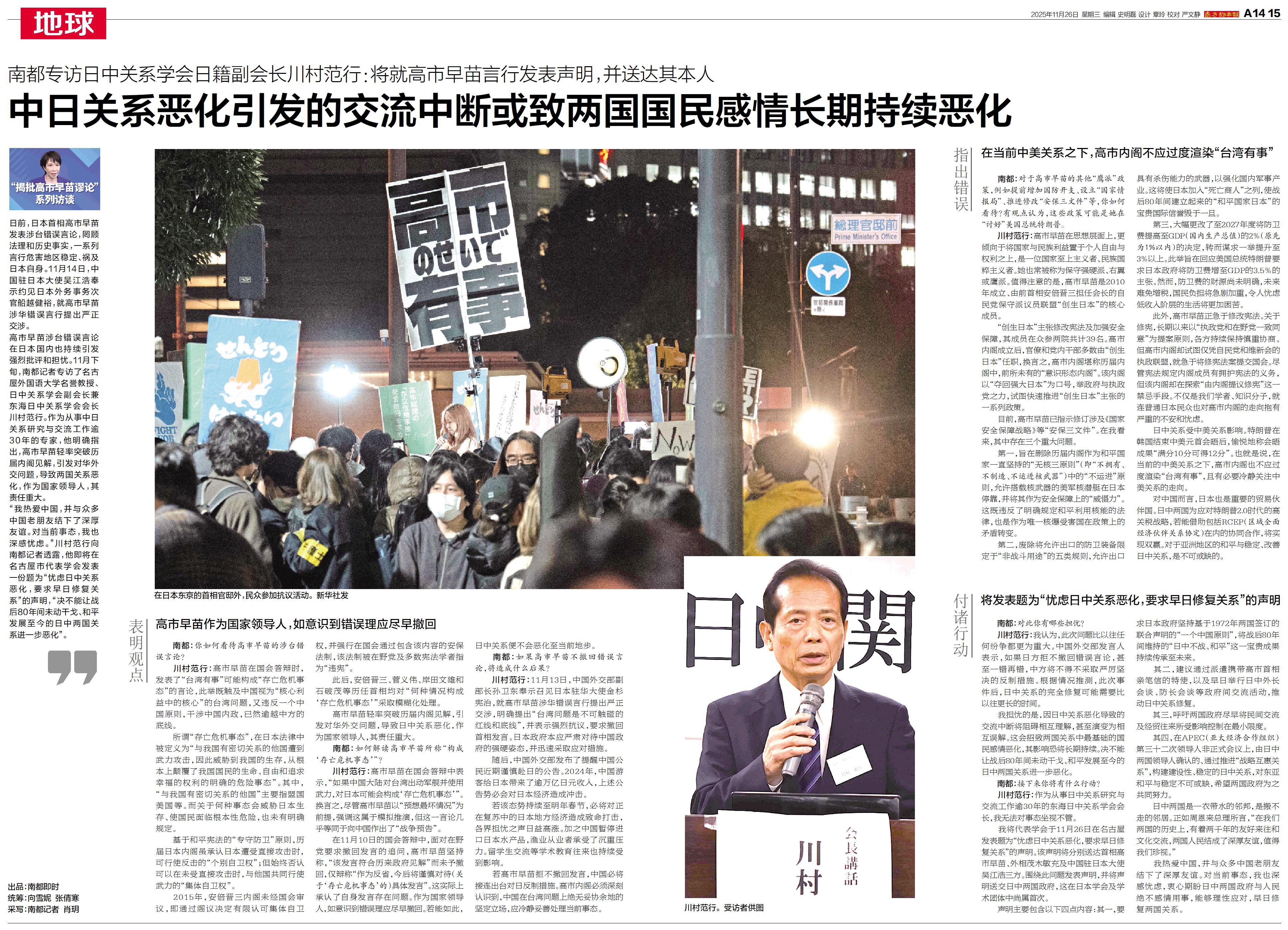 日前,日本首相高市早苗发表涉台错误言论,罔顾法理和历史事实,一系列言行危害地区稳定、祸及日本自身。