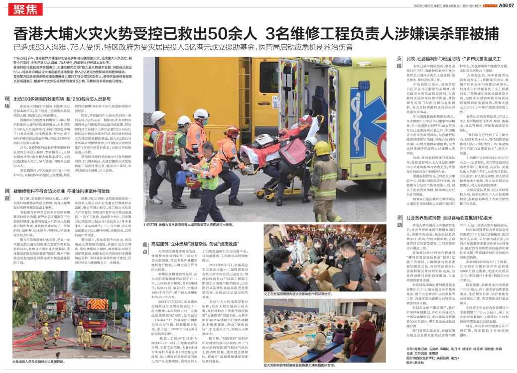 香港大埔火灾火势受控已救出50余人 3名维修工程负责人涉嫌误杀罪被捕