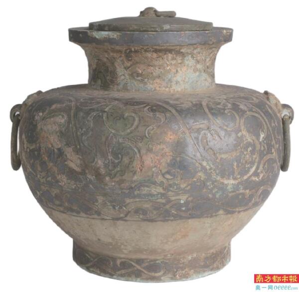 1972年11月底,广东省肇庆市北岭松山,发现了一座战国晚期的土坑木椁墓。错银铜罍就是其中我省首次出土的珍贵文物之一,国家一级文物。形制为:口平,沿宽厚,颈稍高,肩缓平,腹圆,底平带圈足,腹与肩交界处左右两边有对称带环铺(pū)首一对,铺首作鸮头形;罍顶原有盖,盖顶中心部位有钮,钮内套环一个;罍的盖上、口沿、颈部、肩部、腹部、圈足以及铺首和环上等处,全器通体遍错银花纹,纹饰由相互勾连的飞鸟及云气组成,线条流畅,轻快活泼,生动自然,变化多样,细的线条用错银办法,粗的线条则填以朱漆,出土时朱漆的颜色仍然是鲜红艳丽的,但接触空气后,就逐渐褪暗。