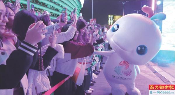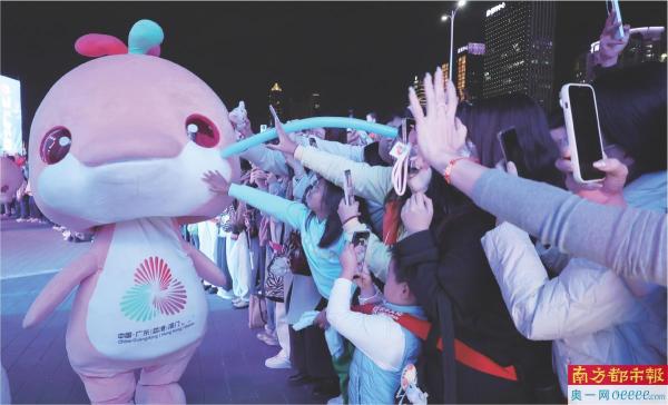 11月20日,广州国际灯光节“全运宝宝游花城”环节,十五运会吉祥物与观众热情互动。 南都记者 高永佳 摄