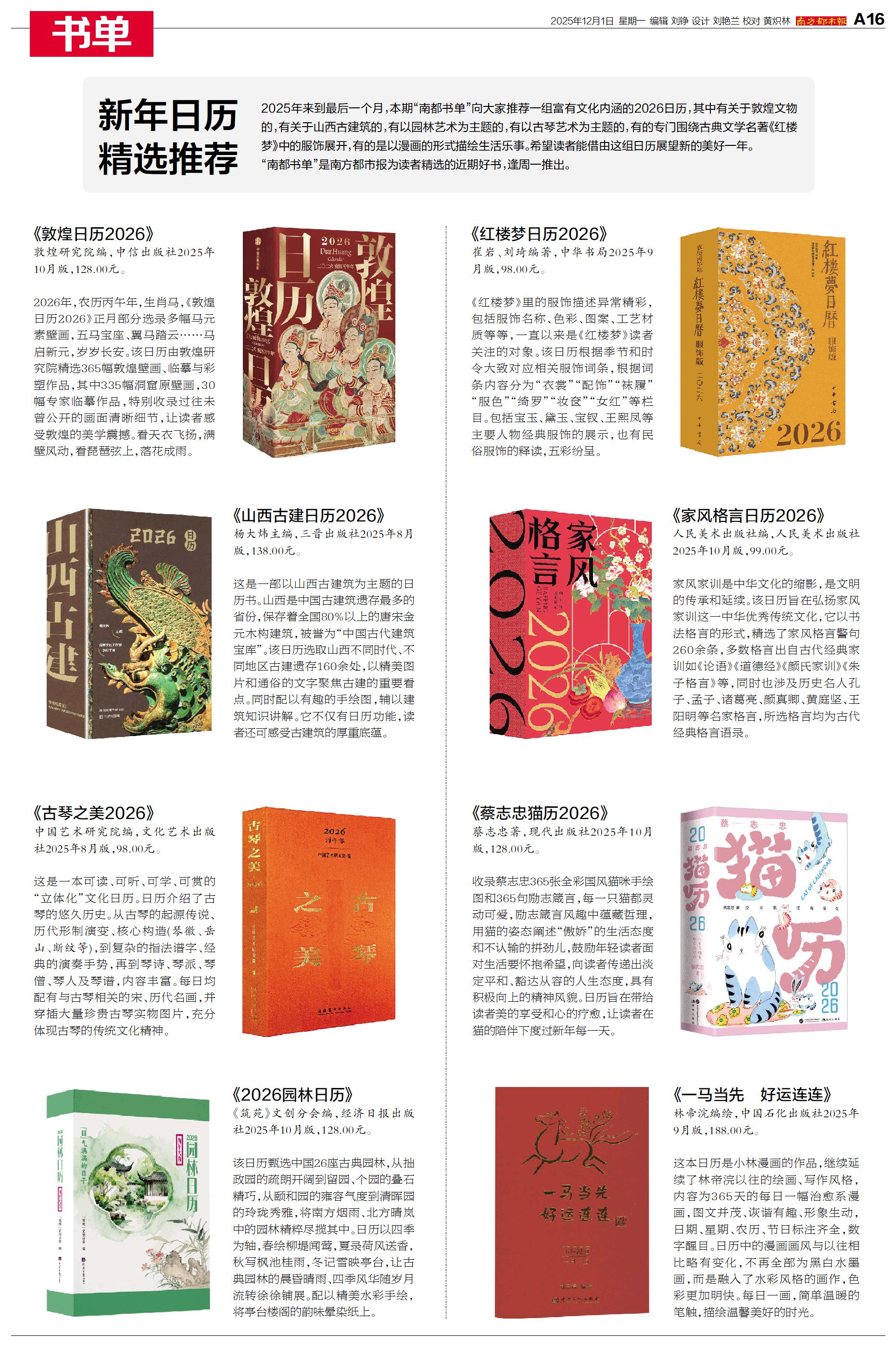 2025年来到最后一个月,本期“南都书单”向大家推荐一组富有文化内涵的2026日历。